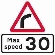 Speed hump/ bump/ ramp = Ralentisseur de vitesse | Dangerous turn, reduced speed = Virage dangereux, vitesse limitée | Entrance to a motorway = Entrée d'autoroute |