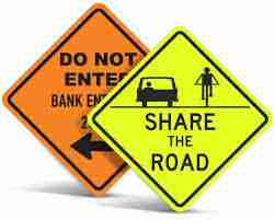 Share the road = Partager la route | No entry= Sens interdit | Road work ahead = Attention, travaux |