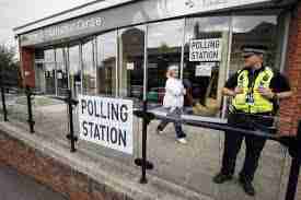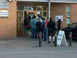 Lining up at a polling station = File d'attente à un bureau de vote  | A temporary polling station =Bureau de vote provisoire  | Polling station in a launderette = Bureau de vote installé dans une laverie  | ... or in a library = ou dans une bibliothèque.  |